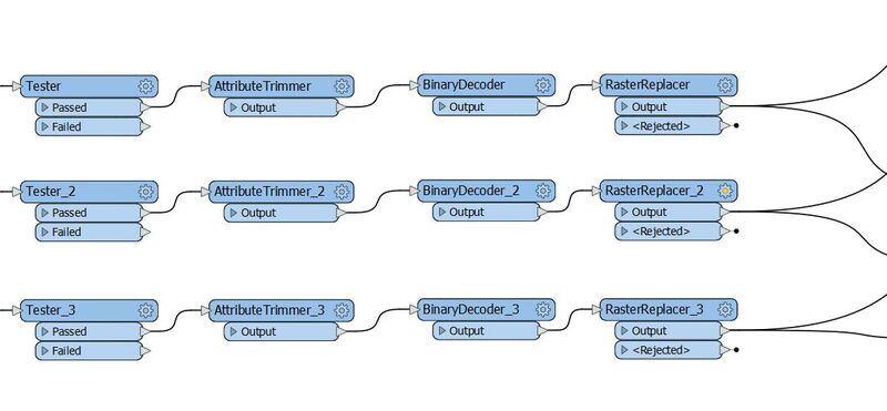 Im Backend kommt dann für die Aufbereitung und Weiterverarbeitung der FME-Server zum Einsatz. Der Kernprozess stellt das Auslesen der base64-Strings aus der Datenbank und die Umsetzung in jpgs mit dem FME BinaryDecoder in Kombination mit dem RasterReplacer dar. In diesem Workflow werden die Fotos gleichzeitig eindeutig benannt und richtig abgelegt. Periodisch werden die fertigen Bilder von einem weiteren FME-Serverjob aus diesem Arbeitsverzeichnis abgeholt und in einen azure-storage hochgeladen.