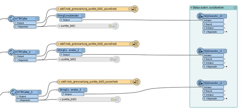 Neben diesen Kernprozessen läuft am FME Server in einem längeren Intervall auch ein Prüfjob, der mit einem „HTTPCaller“-Transformer checkt, ob das betreffende Foto auch tatsächlich aus dem Speicher heruntergeladen werden kann und eventuell korrigiert werden muss.