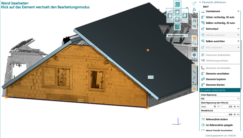 Vollständige BIM-Basismodelle mit allen Geschoßen enthalten auch Wandelemente mit schräg verlaufenden Höhen, etwa bei Giebelwänden. Die neue Version erlaubt den Verschnitt von bestehenden Wand- und Dachelementen. Das erlaubt die vollständige Modellierung auch im Dachgeschoß. Die so entstandenen Wandelemente sind editierbar und werden mit der korrekten Geometrie als Teil des IFC-Modells exportiert.