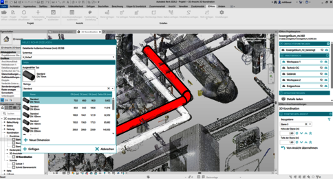 Das Revit-Plugin von rmDATA Reality3D erlaubt die automatische Detektion von Rohrelementen direkt aus der Punktwolke. Die neue Version des Plugins erzeugt optimierte Rohrverläufe inklusive deren Verbindungselemente auf Basis der im Projekt vorhandenen Typfamilien. Das erspart viele manuelle Messvorgänge und ermöglicht eine flüssige Modellierung – auch bei Technikräumen oder komplexen Rohrverläufen.