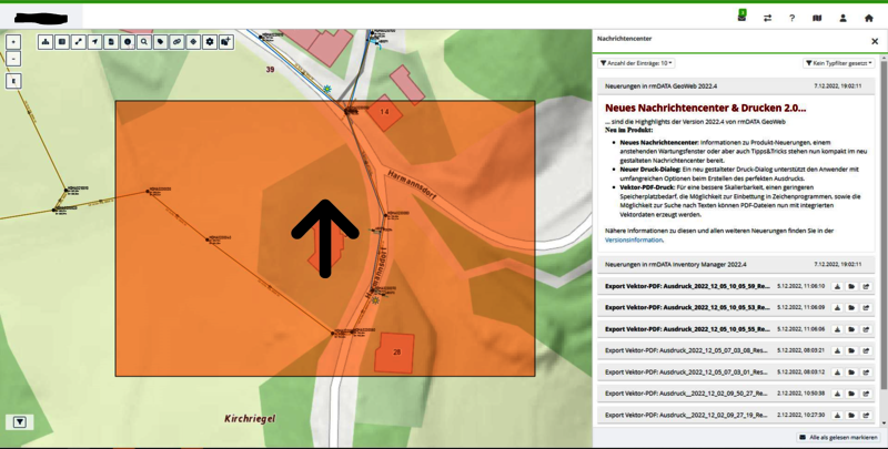 Im Bereich „Druckbereich positionieren“ bestimmen Sie den Druckbereich über das Aufziehen eines Fensters in der Karte, verschieben den definierten Druckbereich oder legen einen fixen Maßstab fest. Neben der verwendeten Druckvorlage bestimmen Sie im Bereich „Zusatzinformationen“ nun auch die benutzerdefinierten Werte der Druckvorlage. In der Druckhistorie finden Sie die zuletzt ausgeführten Druckaufträge mit dem entsprechenden Druck-Status. Fertige Ausdrucke können ganz einfach heruntergeladen, geöffnet oder mit der Hilfe von externen Programmen geteilt werden.