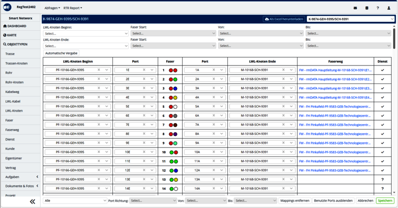 Mit der neuen Version von rmDATA Smart Networx kann der neue Verbindungsdialog nun auch für LWL-Kabel aufgerufen werden. Beschaltungen bzw. Spleißungen führen Anwender nun sehr einfach und flexibel auf Basis eines LWL-Kabels am Begin-Knoten sowie am End-Knoten in einer übersichtlichen Tabelle durch.