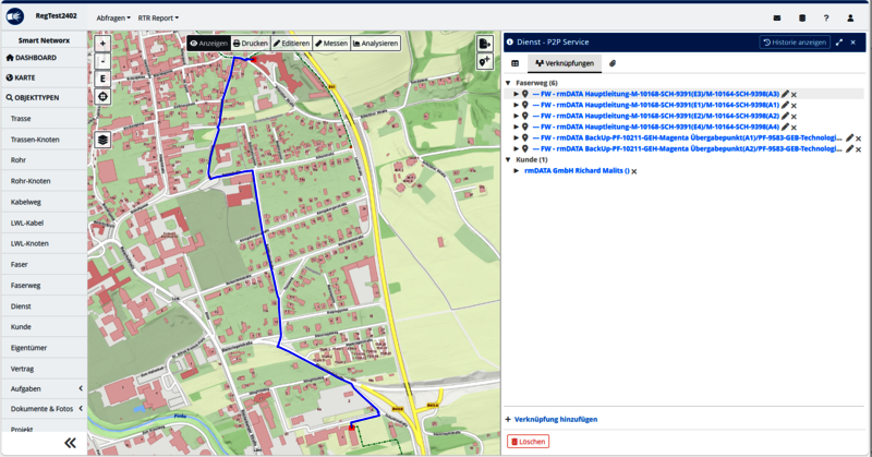 Einzelne Dienste können, etwa im Falle von Firmenkunden, auch mehrere Faserwege umfassen. Mit der neuen Version visualisieren Sie einzelne Faserwege auch über den Verknüpfungsbaum ganz einfach in der Karte. So erhalten Sie mit einem Klick den genauen Trassenverlauf direkt in der Karte.